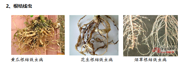 ?????黃瓜根結(jié)線蟲屬于南方根結(jié)線蟲,根系受害后發(fā)育不良,側(cè)根須根增多,并在其上形成球形或圓錐形大小不等的瘤狀物,嚴(yán)重時地上部分發(fā)育不良,植株矮小,葉色黃,中午萎蔫,嚴(yán)重時枯死,易誤認(rèn)為是枯萎病株。