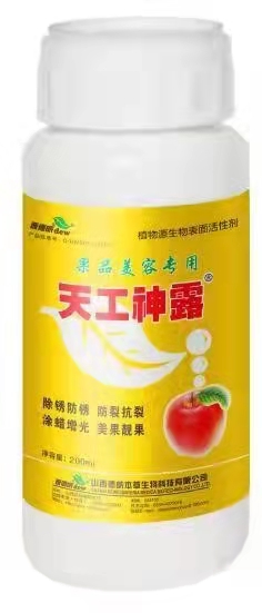 - 除銹防銹。可在果面產(chǎn)生一層天然保護膜—–“高脂膜”,阻止生物或非生物因子對果面侵染,預(yù)防化學(xué)農(nóng)藥對果面刺激產(chǎn)生果銹,并能溶解吸收果垢,凈化果面。
