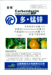 本品為廣譜治療兼保護性殺菌劑,是由多菌靈和代森錳鋅兩種制劑復(fù)配而成,具有保護和治療作用,無論發(fā)病前或發(fā)病早、中、晚期均可使用。由于兩者的協(xié)同殺菌效應(yīng),其藥效倍增,具有防治譜廣,不易產(chǎn)生抗性,防治效果明顯優(yōu)于單劑代森錳鋅、多菌靈的效果。對果樹、梨、葡萄、桃、柑桔、蔬菜、棉花、花生、煙等作物的多種真菌性病害,如蘋果樹斑點落葉病、褐斑病、輪紋病、炭疽病,柑桔樹瘡痂病等病害具有明顯的防治效果。本品細度愈高,藥效越好,對作物越安全,在花期、幼果期均可使用。
